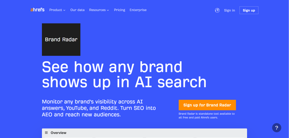 AI prompt monitoring andTracks visibility in AI Overviews, ChatGPT, Perplexity, and similar platforms while linking mentions to source content.
