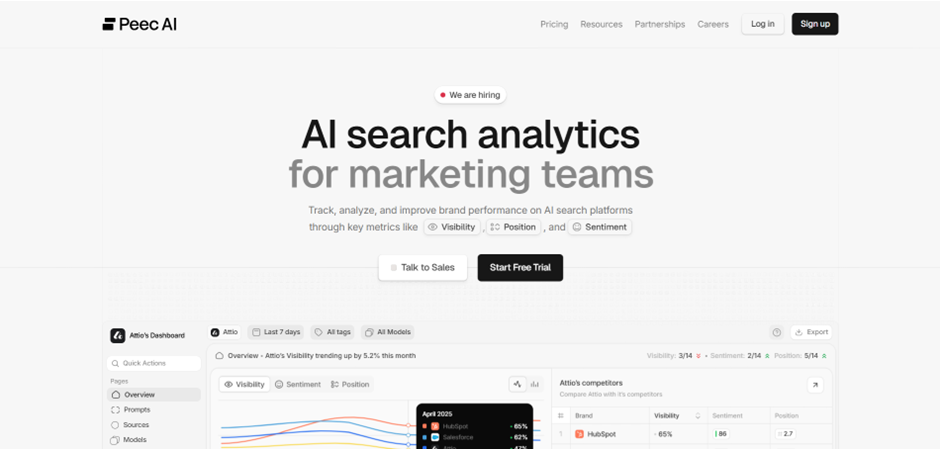 Peec AI simplifies tracking when and where your brand appears in AI-generated responses. It places emphasis on both frequency of mentions and the sentiment or context in which brands are referenced.