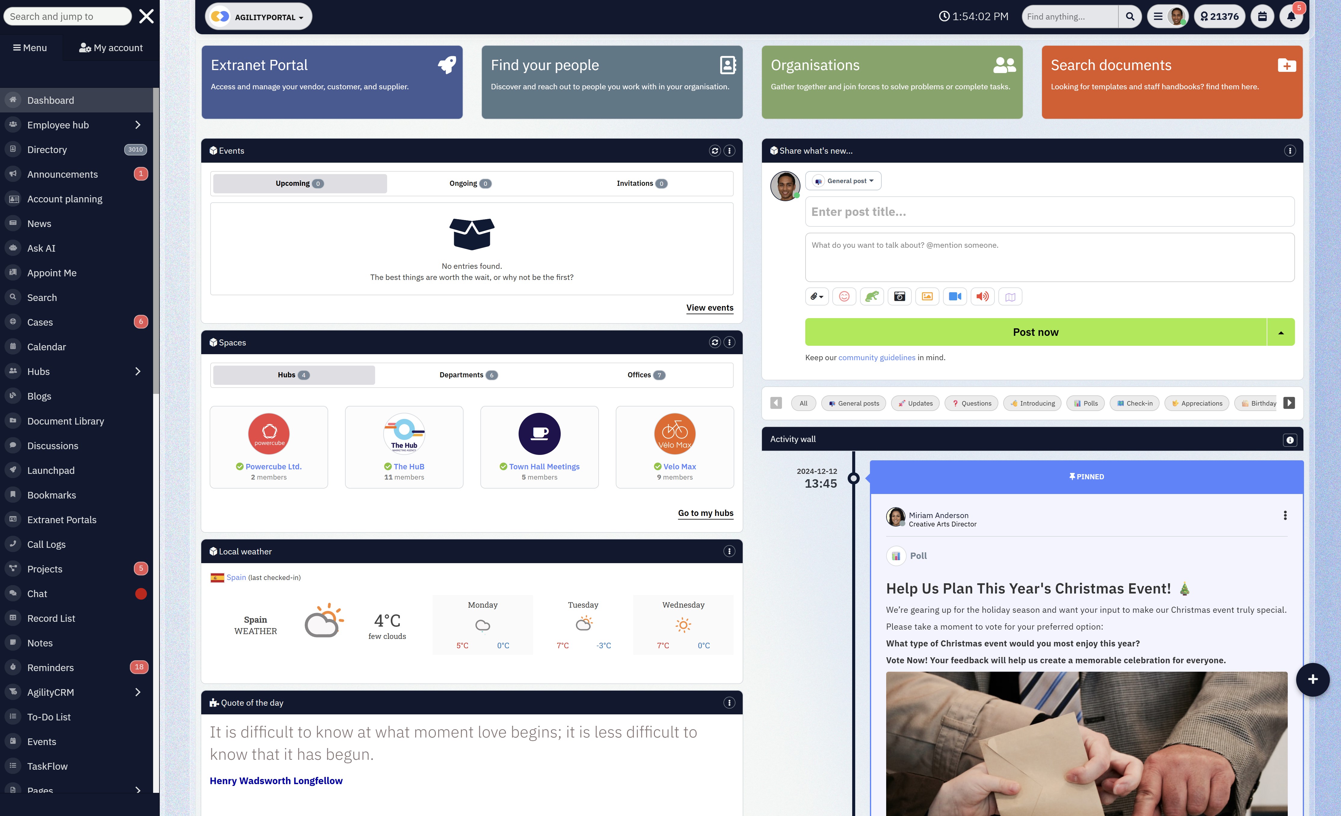 AgilityPortal brings communication, collaboration, documents, and workplace tools into one practical daily workspace—built for office staff, remote teams, and frontline workers alike.