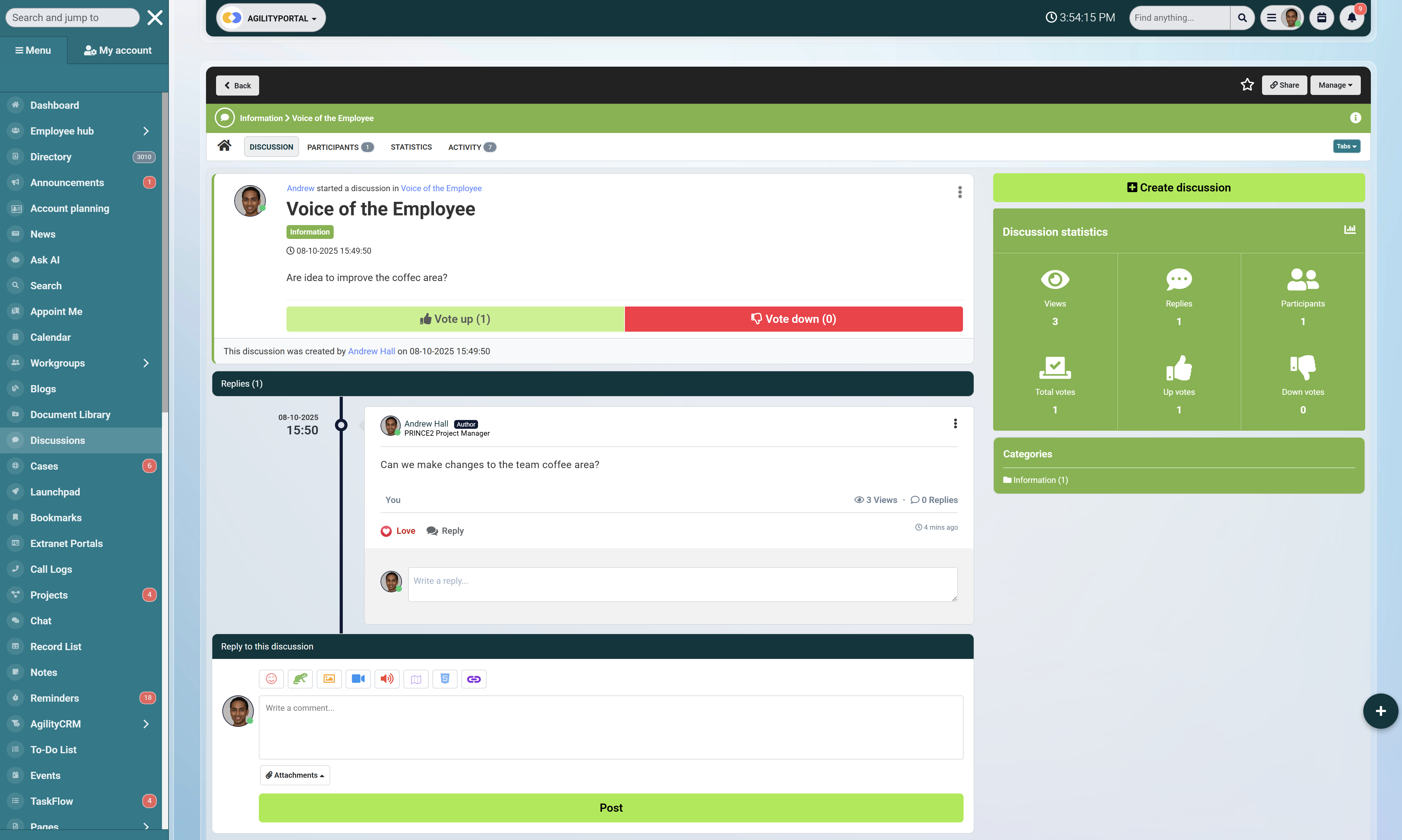 For remote or hybrid teams, digital employee forums in the workplace — such as those built into AgilityPortal — provide a centralized online space for communication. Employees can post suggestions, join discussions, and share feedback from anywhere.