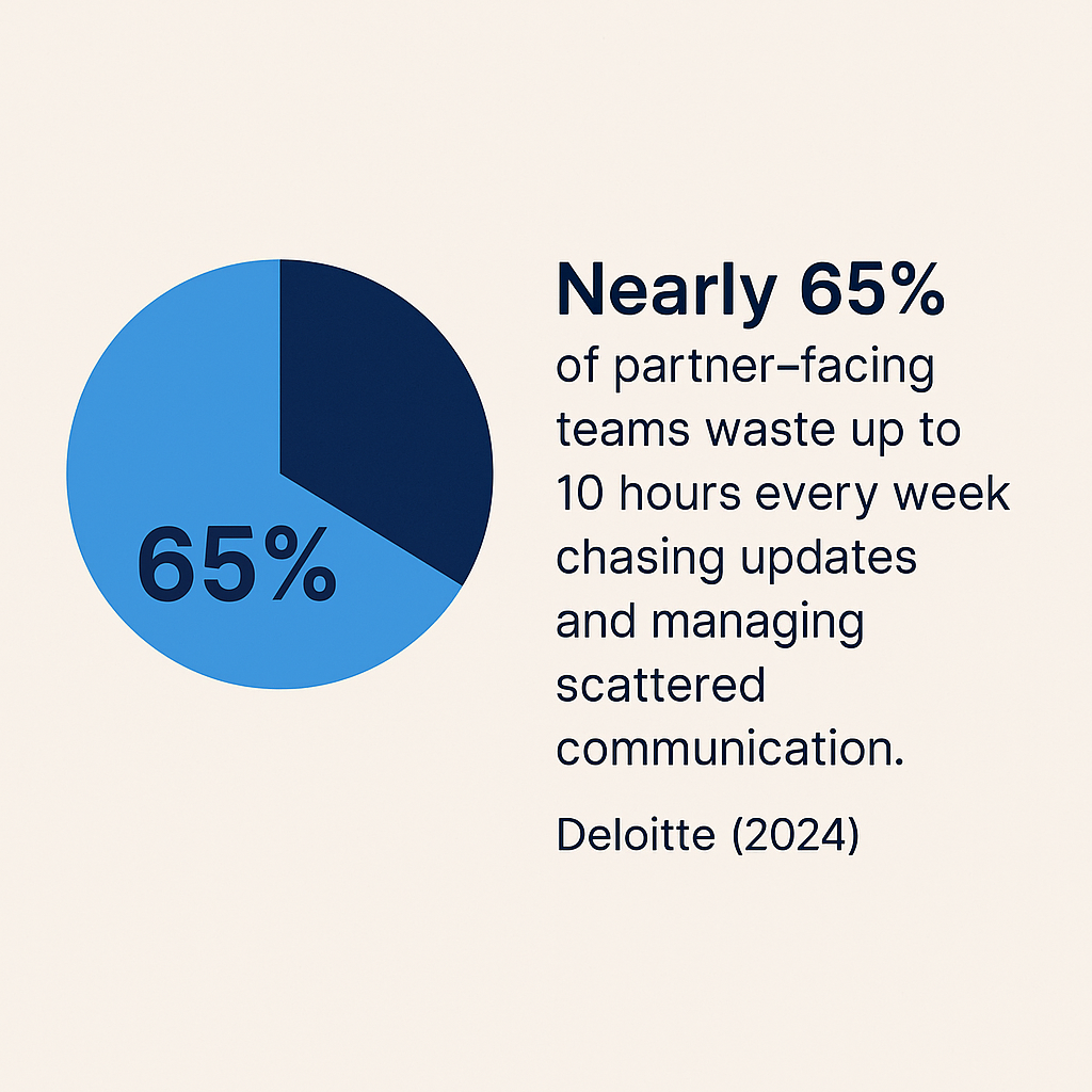 According to Deloitte (2024), nearly 65% of partner-facing teams waste up to 10 hours every week chasing updates and managing scattered communication.
