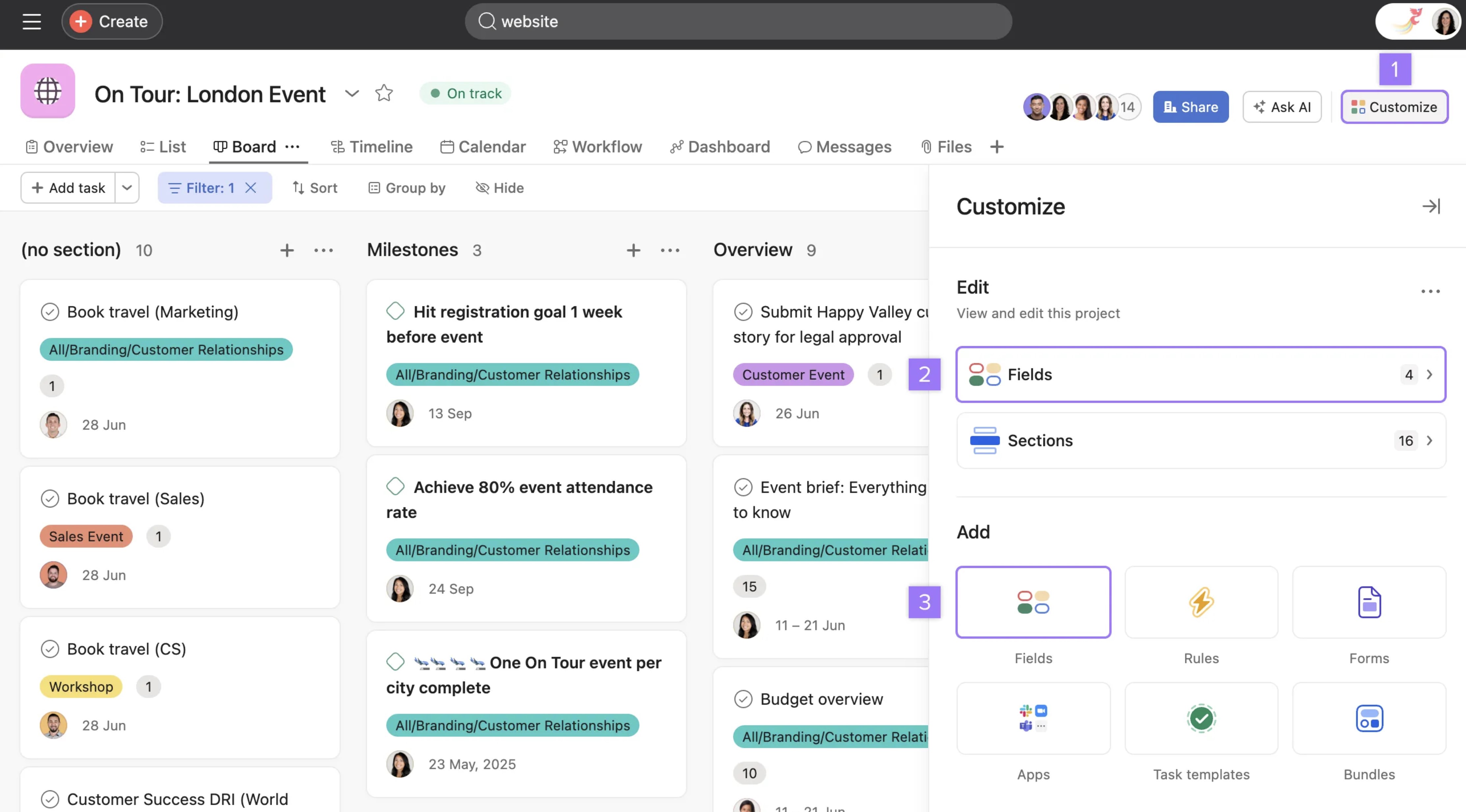 - Multiple views including List, Board, Timeline, Gantt, and Calendar