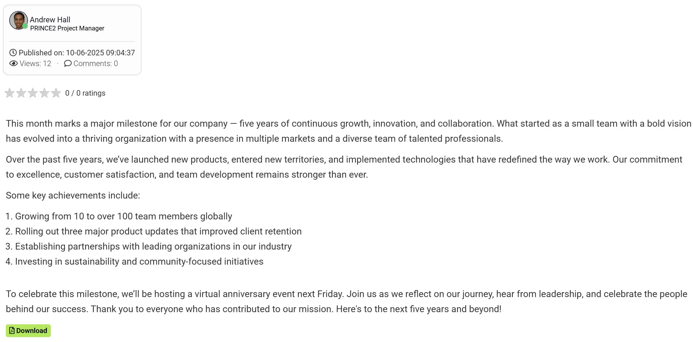 Instead of inbox overload, employees began checking the portal daily to read new stories, celebrate milestones, and comment on team wins. The shift wasn't just about technology — it was about creating a habit of communication that felt personal, transparent, and inclusive.