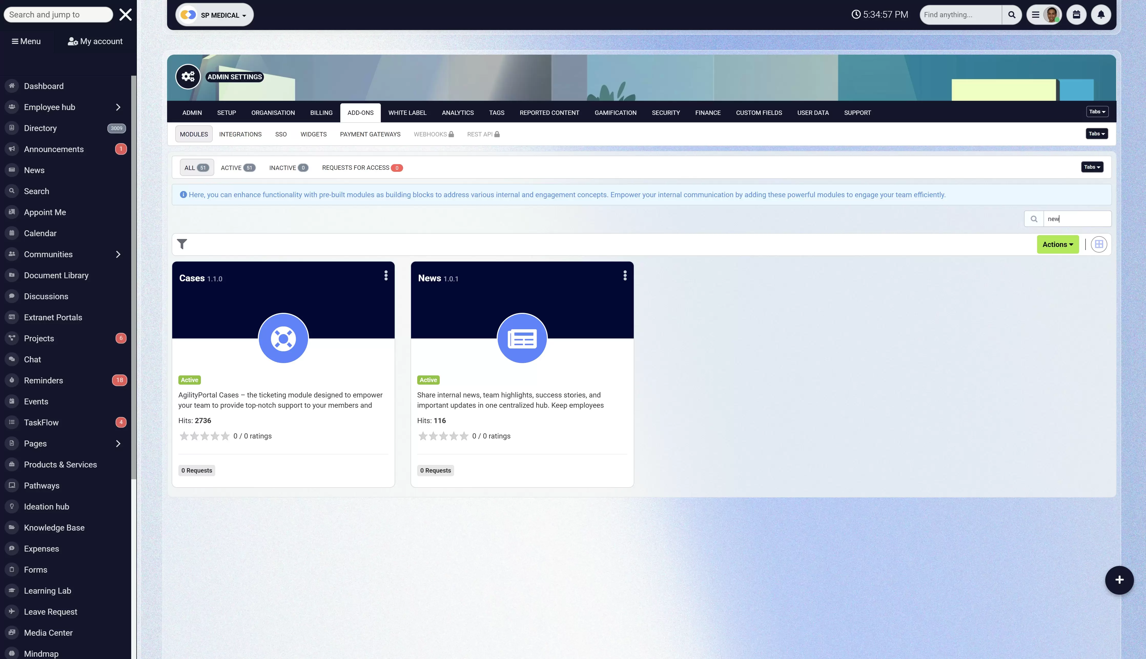 - Go to "Modules → News" on your AgilityPortal admin dashboard - This is your central hub for all company news, updates, and internal newsletters. From here, you can manage stories, announcements, and engagement posts in one organized space.