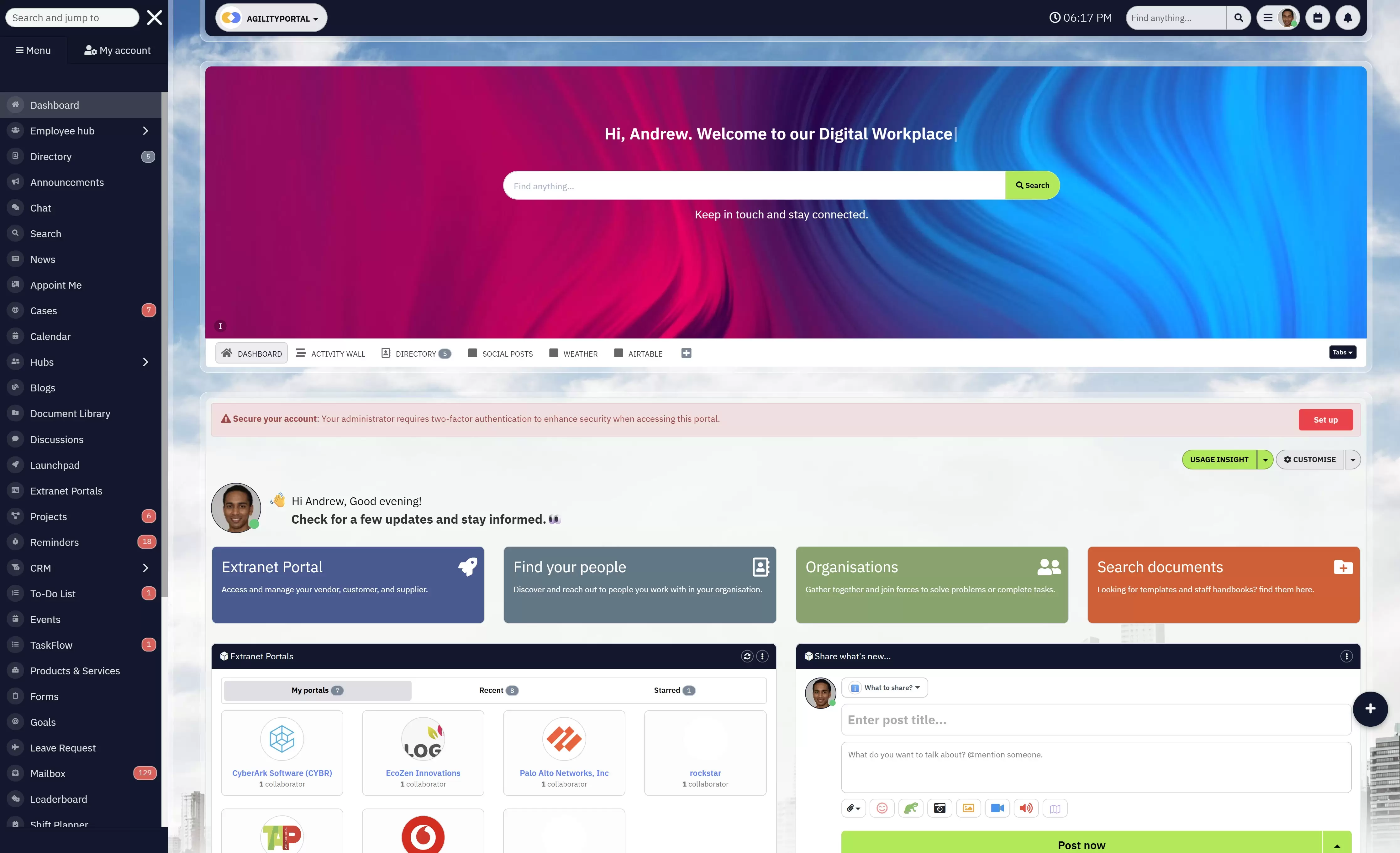 AgilityPortal also supports scalability across office-based, frontline, and multi-site environments with mobile-first access, deep Microsoft and Google integrations, recognition tools, and secure governance controls.