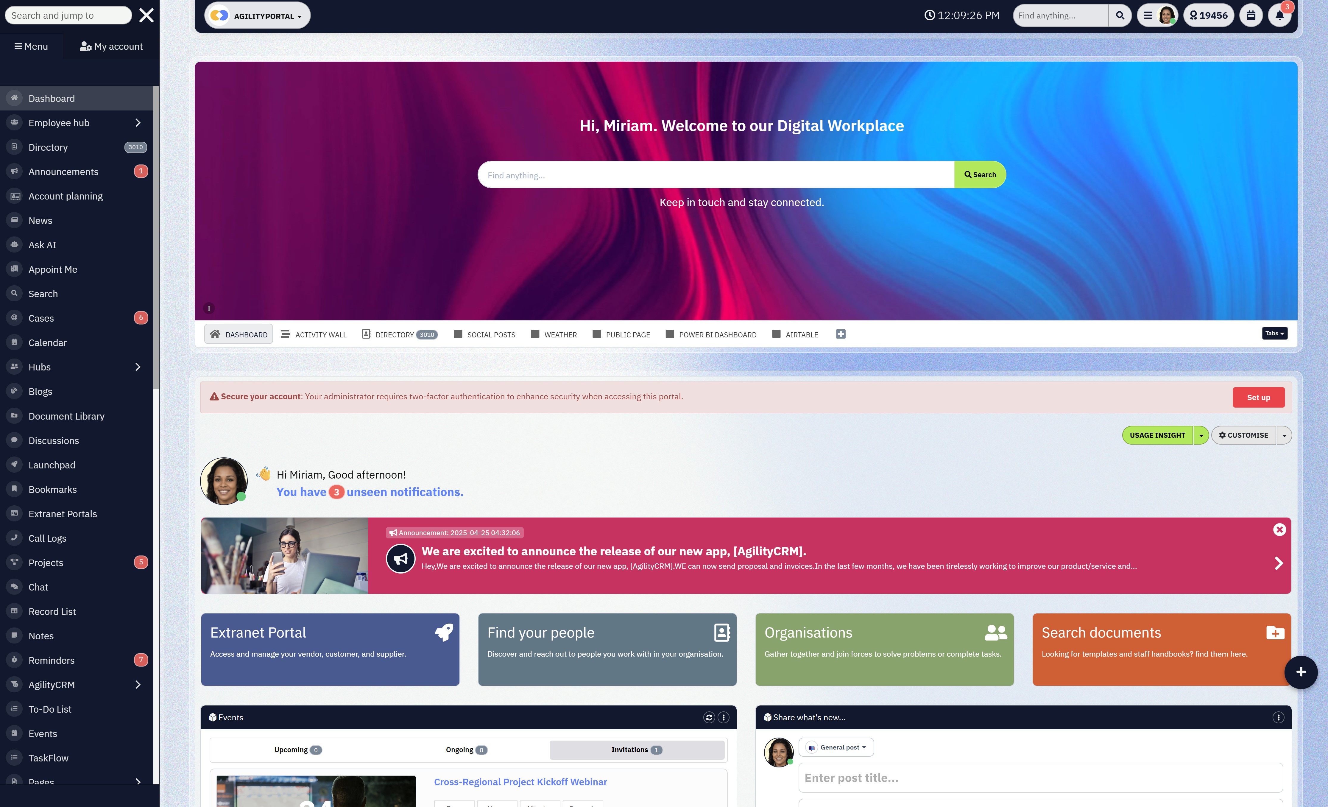 AgilityPortal is a modern Digital Workplace platform designed to bring communication, documents, knowledge, collaboration, and employee experience into one simple hub.